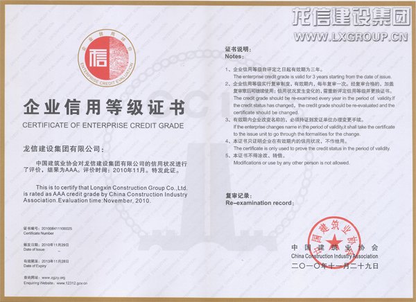 2011年1月17 日,全國(guó)建筑業(yè)第二批AAA信用企業(yè)發(fā)布會(huì),在北京科技會(huì)堂隆重舉行,建設(shè)部市場(chǎng)司、質(zhì)量司、商務(wù)部、國(guó)資委、建筑業(yè)協(xié)會(huì)相關(guān)領(lǐng)導(dǎo)出席發(fā)布會(huì)。集團(tuán)公司憑借多年來(lái)誠(chéng)實(shí)守信的經(jīng)營(yíng),獲得這一榮譽(yù)。建筑業(yè)協(xié)會(huì)秘書(shū)長(zhǎng)吳濤向公司授牌。
