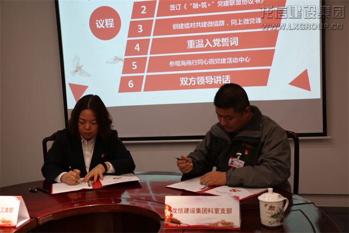 本次活動以“融·筑+”黨建結(jié)對共建為主題,全體黨員共同重溫入黨誓詞,堅定理想信念。龍信集團(tuán)科室支部副書記施金浩與海門農(nóng)商行機(jī)關(guān)第三黨支部書記劉曉艷共同簽訂《“融·筑+”黨建聯(lián)盟協(xié)議書》,以“黨建互促、服務(wù)互聯(lián)、專業(yè)互助、資源互享、廉政互督”為原則建立聯(lián)系、加強(qiáng)溝通,實現(xiàn)信息共享、優(yōu)勢互補(bǔ)。現(xiàn)場黨員們共同創(chuàng)建“融·筑+”黨建結(jié)對共建微信群,同上“微黨課”《讓信仰之光在心中閃亮》。隨后大家重溫入黨誓詞并參觀海門農(nóng)商銀行同心圓黨建活動中心。