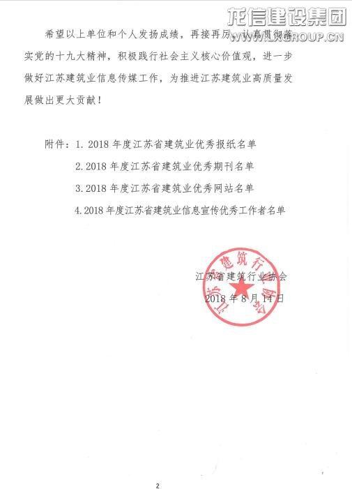 近日,江蘇省建筑行業(yè)協(xié)會公布了2018年度江蘇省建筑業(yè)信息傳媒工作競賽評審結(jié)果。《龍信》雜志榮獲2018年度江蘇省建筑業(yè)優(yōu)秀期刊,龍信網(wǎng)站(www.lxgroup.com)榮獲2018年度江蘇省建筑業(yè)優(yōu)秀網(wǎng)站。